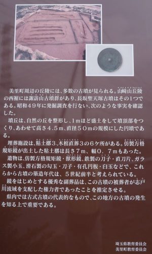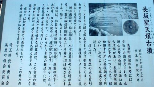 長坂聖天塚古墳 円墳 径60m、高さ4.5 関 丘陵、山林 直刀、剣、石製品、鏡、粘土槨3、木棺直葬3、周掘、地山整形の墳丘 埼玉県古墳詳細分布調査報告書、埼玉の古墳(児玉)