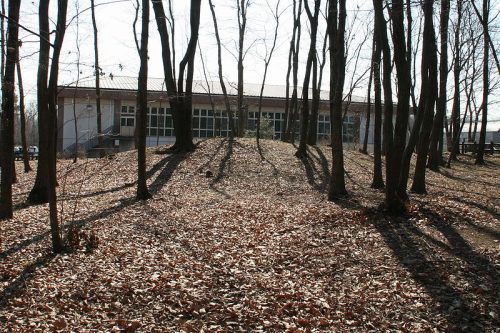 5号墳。武道館の隣にある。南側の横穴式石室があった部分が窪んでいる。