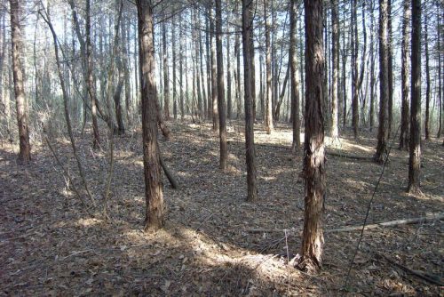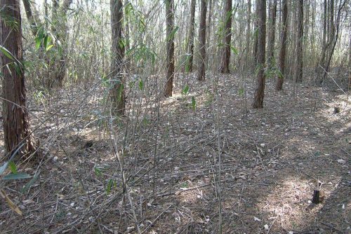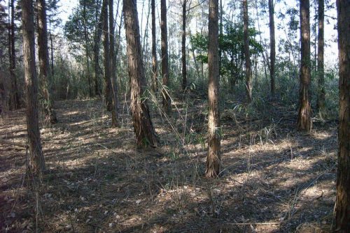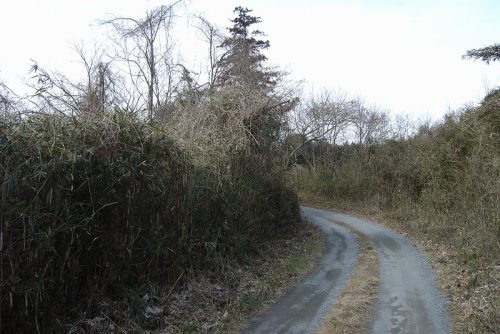普門寺から分布域に至る道。この先もほとんど藪にびっしりと覆われている。一部杉林の部分は見通しがきくので探ってみた。