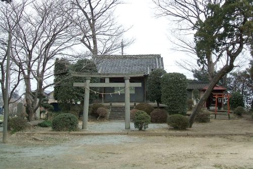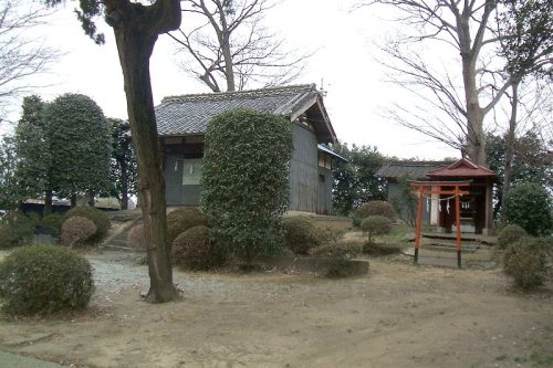南東から。南側以外はコンクリートの土留めで囲われ原型を留めていない。社殿の乗るマウンドの脇に小社の乗る一段低いマウンドがある。