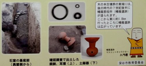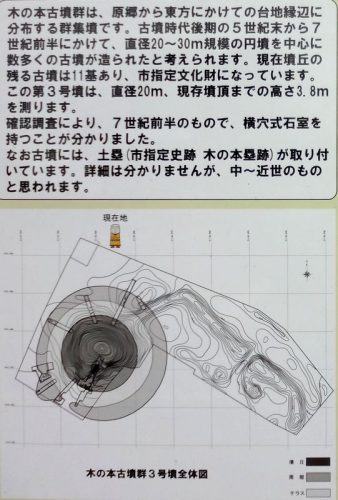 木の本古墳群3号墳(氏神塚) 円墳 径約20m、高さ約3..8m 原郷字木の本 台地 横穴式石室、人骨、歯牙、鉄鏃、刀子、鉄刀、刀装具、銅釧、耳環、土師器 現地説明板、埼玉の古墳(大里)