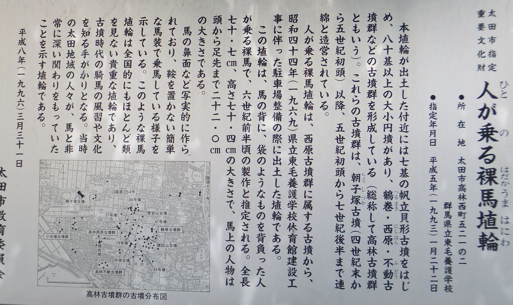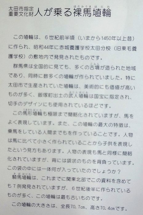 太田市人が乗る裸馬埴輪(高林古墳群) 90群馬県, お_太田市, 旧お_太田市, 綜さ_澤野村 コメントを追加 6月 082024 高林西原古墳群は、県立がんセンター周辺の台地上に分布しています。引用現地案内板 高林古墳群の1基から出土した騎馬埴輪で、現在は県立ガンセンターのロビーに展示されている。6世紀前半のものと見られ、関東地方出土の同種のもとのとしてはもっとも古い。 (撮影 2002/03)太田市人が乗る裸馬埴輪(高林古墳群) 返信する 返信をやめる Your Comment 以下のHTML タグと属性が利用できます: <a href="" title=""> <abbr title=""> <acronym title=""> <b> <blockquote cite=""> <cite> <code> <del datetime=""> <em> <i> <q cite=""> <s> <strike> <strong> Name (required) E-mail (required) URI 次回のコメントで使用するためブラウザーに自分の名前、メールアドレス、サイトを保存する。