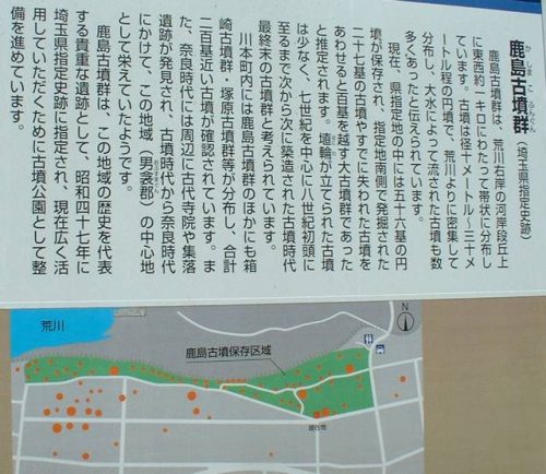深谷市鹿島古墳群案内板 80埼玉県, ふ_深谷市, 旧か_川本町 コメントを追加 8月 022025 鹿島古墳群は、荒川右岸の河岸段丘上に分布する群集墳で6世紀から8世紀にかけての築造と推定されています。かつては100基以上ありましたが現存するのは56基です。【アクセス】秩父鉄道大麻生駅から徒歩・自転車3.8km、公園駐車場、見学自由 ★地図★古墳名 墳形 規模 所在地 立地 出土品、備考 引用鹿島古墳群 本田字鹿島 他 台地 埼玉の古墳(大里)、古墳時代の深谷 古墳公園として保存されている。春には桜や菜の花が見事でお勧め。 (撮影 2002/06、2008/04) 返信する 返信をやめる Your Comment 以下のHTML タグと属性が利用できます: <a href="" title=""> <abbr title=""> <acronym title=""> <b> <blockquote cite=""> <cite> <code> <del datetime=""> <em> <i> <q cite=""> <s> <strike> <strong> Name (required) E-mail (required) URI 次回のコメントで使用するためブラウザーに自分の名前、メールアドレス、サイトを保存する。