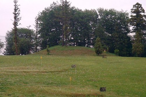 南から。諏訪山丘陵から伸びる支丘の頂部にあり、現在はゴルフ練習場敷地に取り込まれている。未調査のため詳細は不明。(練習しながら撮影。古墳と知っていて球を打っている人なんてほとんどいないだろうな。)