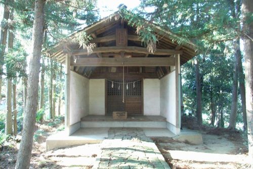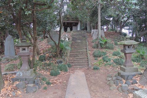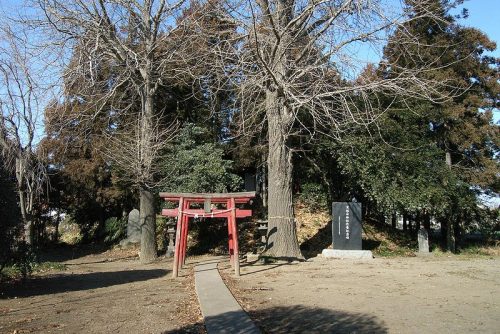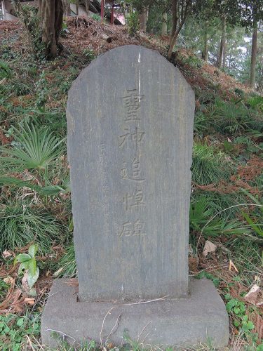裾に安置された「霊神追悼碑」。四十坂(四十塚)古墳群内で昭和4年に発掘された高塚古墳跡に建立されたもので、その後寅稲荷神社に移築されたようだ。裏面には出土品(金環、勾玉、直刀、埴輪など)が記されている。