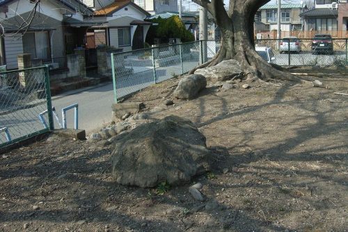 石室があった場所。根石部分しか残っていなかったが、河原石小口積の胴張りで全長約6.1mのものであった。