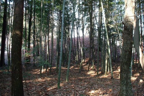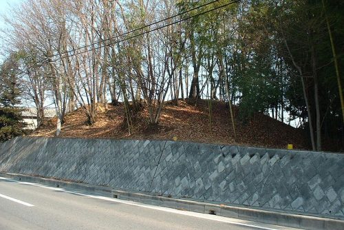 南西から。西側は県道で削られています。埴輪片が少量出土しており6世紀末の築造と推定されている。