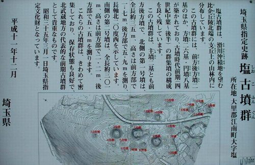 塩古墳群第1支群は、県道11号線沿いの八幡神社南側の丘陵上に分布しています。前方後方墳2基、方墳26基、円墳8基からなり、古墳時代前期の築造と考えられます。県指定史跡。【アクセス】秩父鉄道大麻生駅から徒歩・自転車6.7km、駐車場無し ★地図★