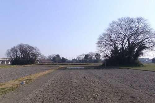宮塚古墳上から見る。全面畑地となり原形を留めていない。奥に見えるのは2号墳。