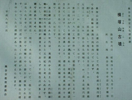 横塚山古墳 前方後円墳 全長30m、後円部径22.5m、前方部幅12m、後円部高3.2m、前方部高2.5m 中奈良字横塚 自然堤防、田 円筒埴輪 朝顔形円筒埴輪、周堀確認 HPくまがや遺跡情報