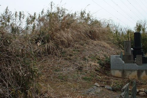 2号墳。南がわは墓地で削られています。周辺の墓地は古い石塔が多く見られます。お墓参りにきていたお年寄りの話によると、この塚は「まき塚」と呼ばれているそうです。