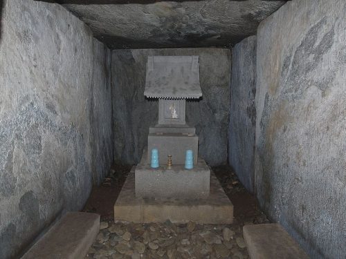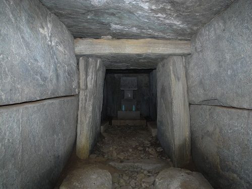玄室。奥行き2.6m、幅1.66m、高さ1.86m。天井石は一枚の巨石を使用。八幡様を祀る。