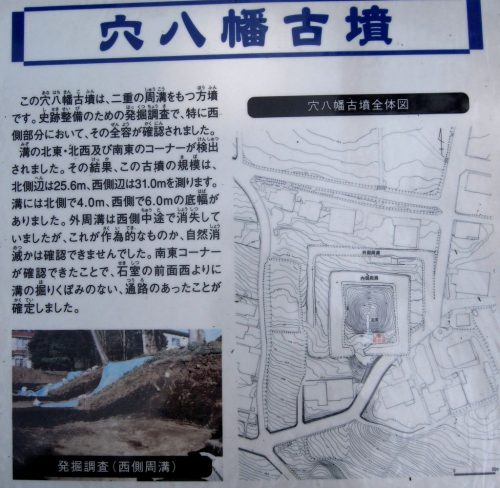 穴八幡古墳 方墳 北側辺25.6m、西側辺31.0m、高さ約5.6m 増尾字岩穴 丘陵 周溝、横穴式石室、須恵器、土師器、鉄器、刀装身具 埼玉の古墳、現地案内板