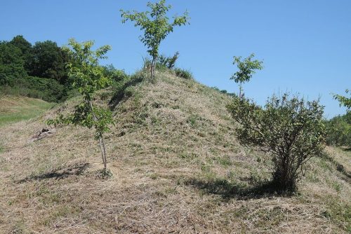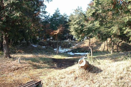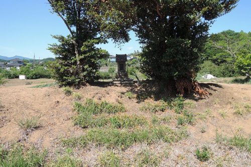 22号墳。墓地の北側の丘陵上にあります。中央の祠の乗っている高まりが墳丘
